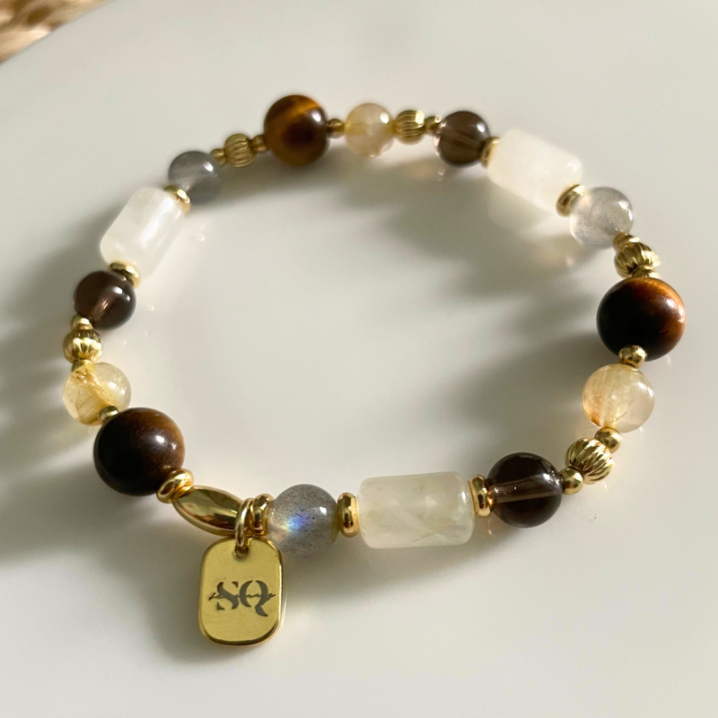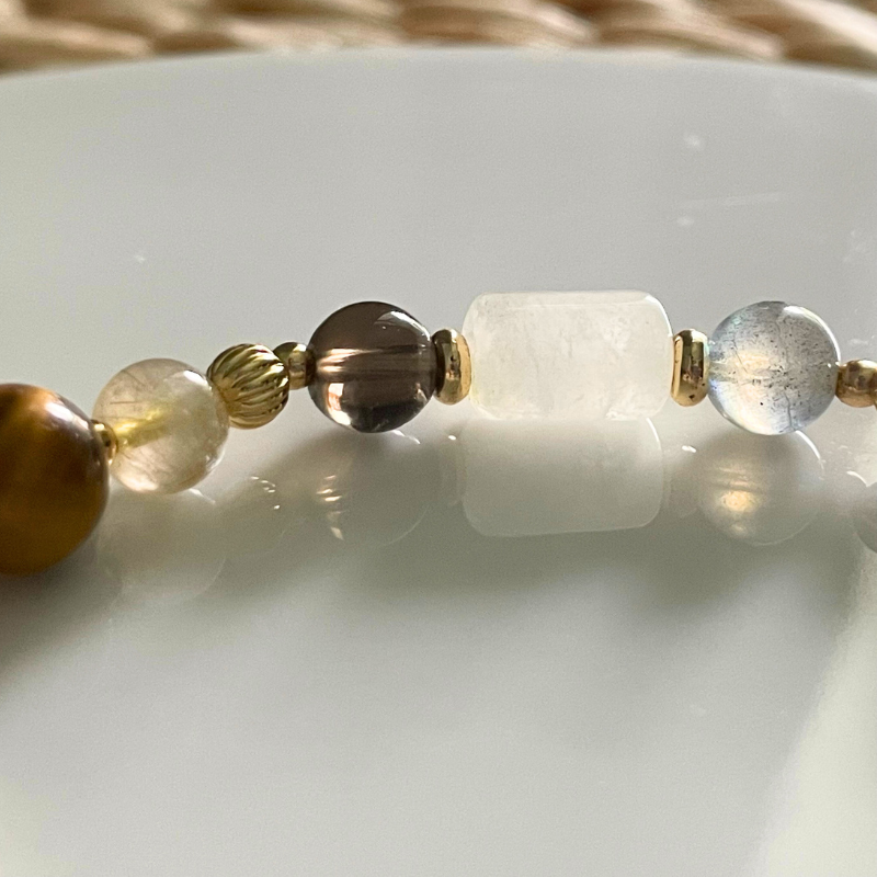 茶晶、虎眼石、黃水晶、拉長石、白水晶