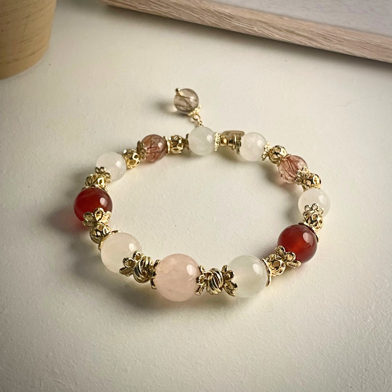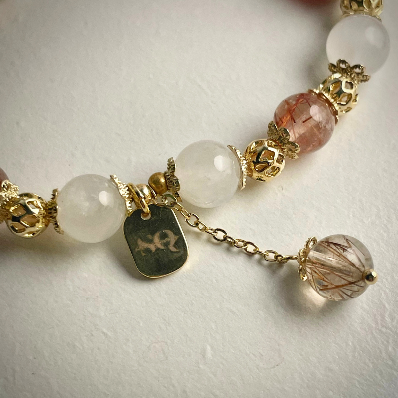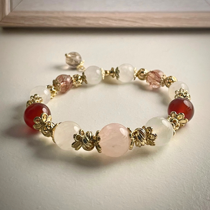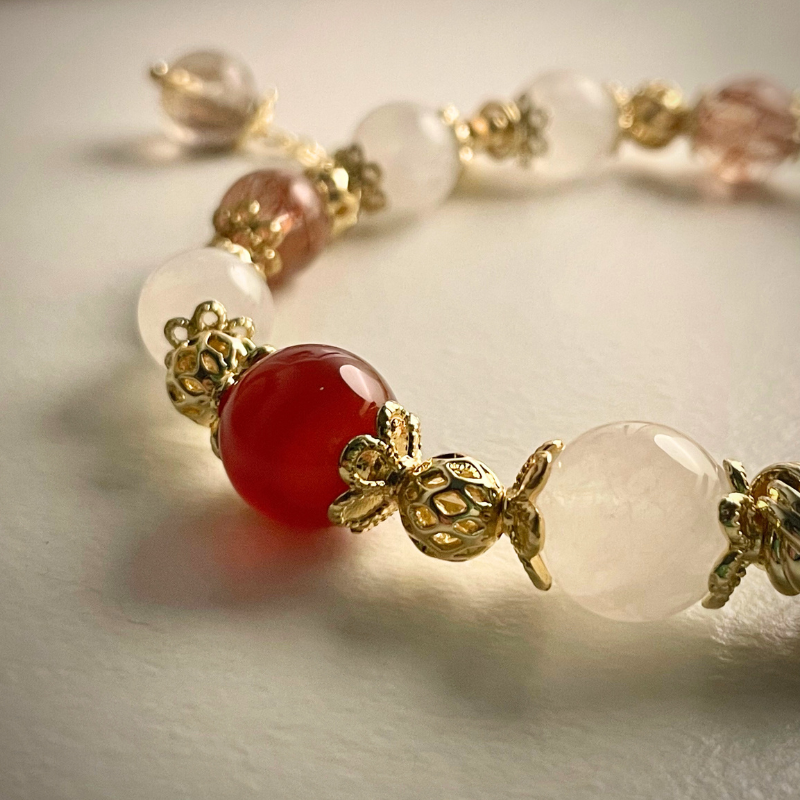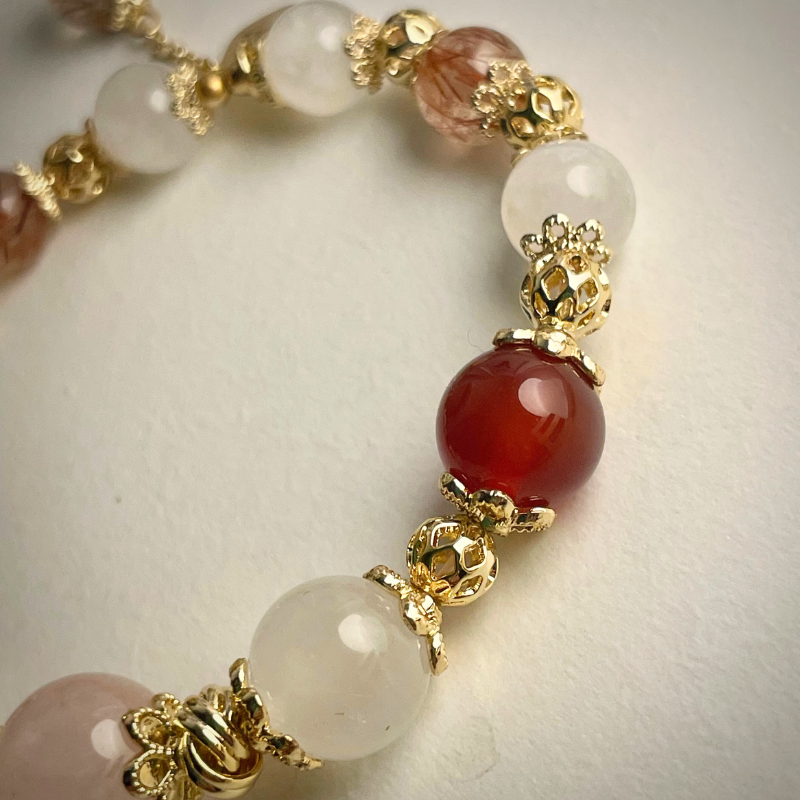 粉水晶,南紅瑪瑙、藍月光石、紅銅鈦晶
