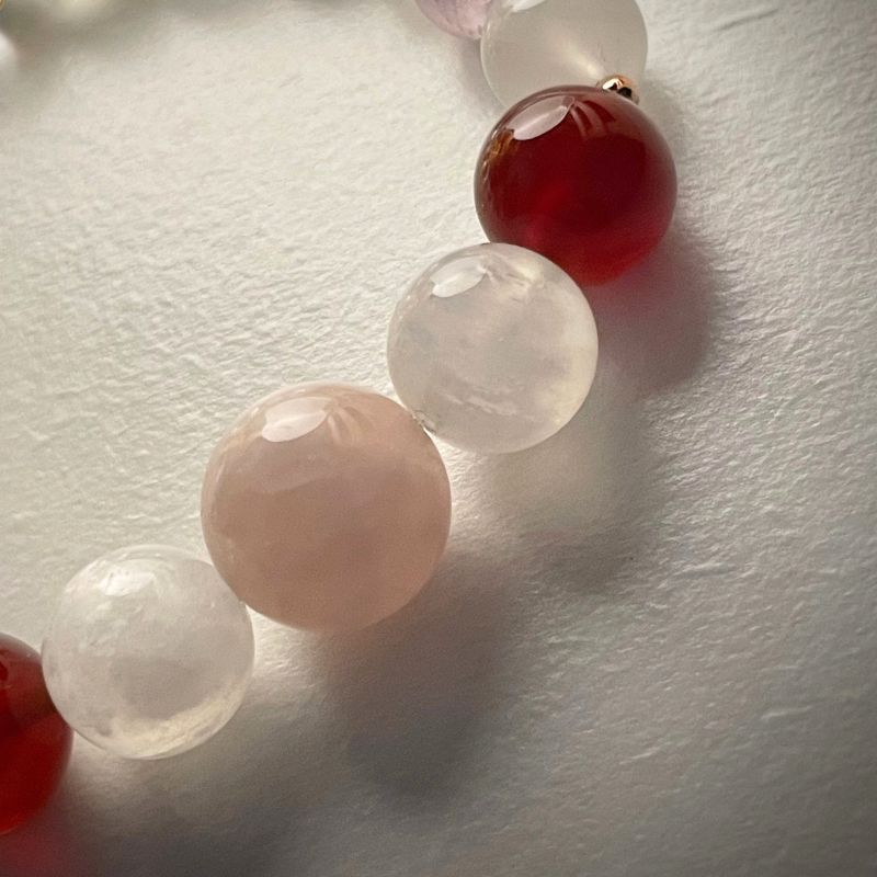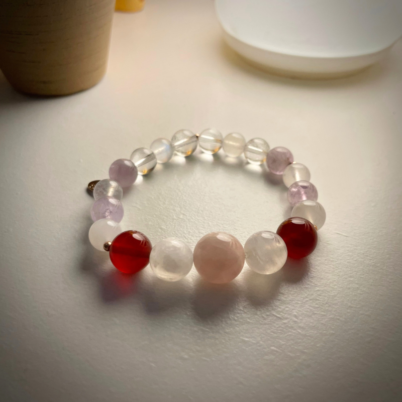 粉水晶,南紅瑪瑙、藍月光石、薰衣草石、白水晶